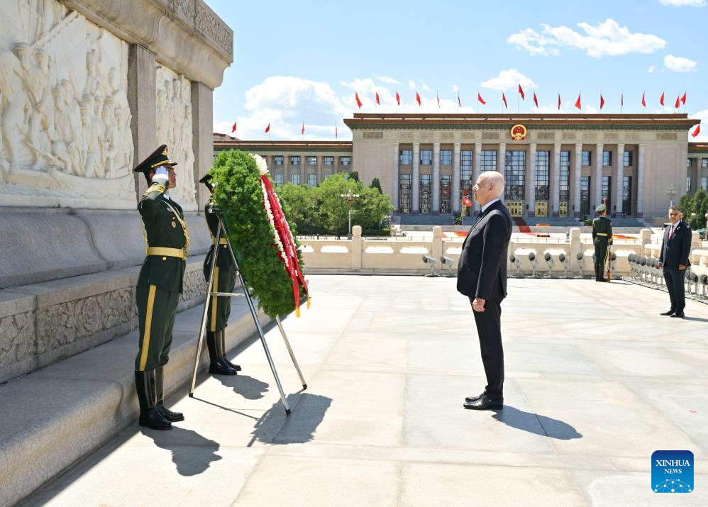 Tunisian President Kais Saied lays a wreath at the Monument to the People's Heroes on the Tian'anmen Square in Beijing, capital of China, May 31, 2024. (Xinhua/Gao Jie)