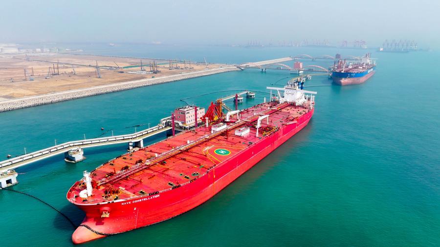 An aerial drone photo taken on March 29, 2024 shows a vessel offloading fuel at an oil terminal of Lanshan Area of Rizhao Port in Rizhao, east China's Shandong Province. (Xinhua/Guo Xulei)
