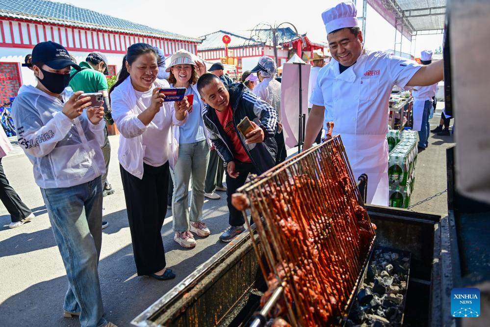 People take photos of lamb dishes during a lamb cooking contest in Yumin County of Tacheng Prefecture, northwest China's Xinjiang Uygur Autonomous Region, June 2, 2024. (Xinhua/Ding Lei)