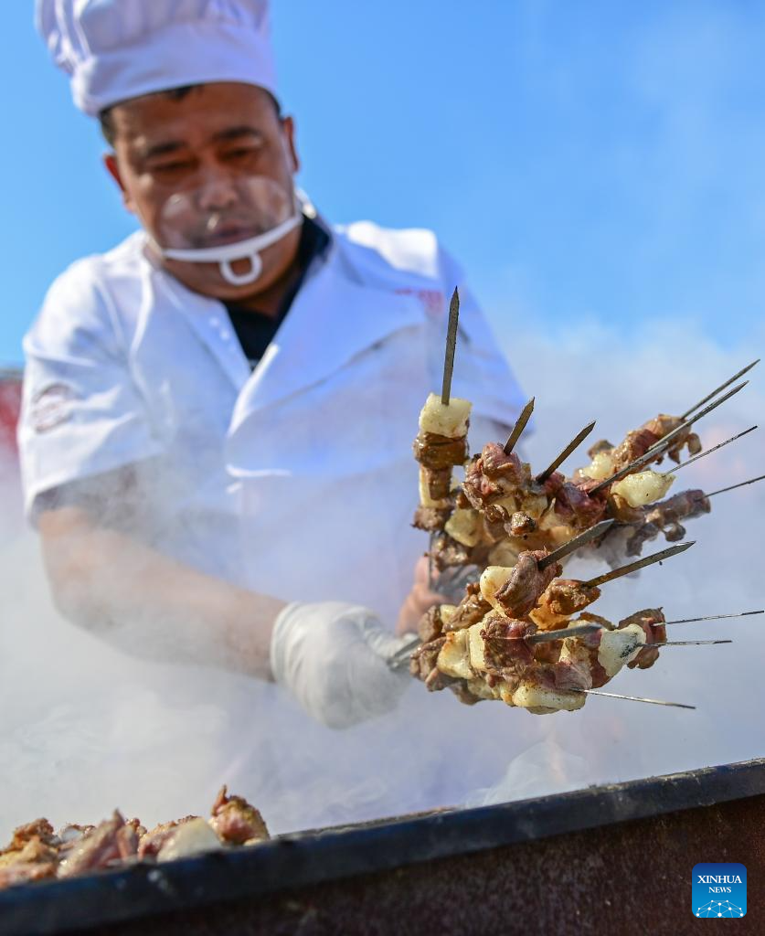 A chef grills kebabs during a lamb cooking contest in Yumin County of Tacheng Prefecture, northwest China's Xinjiang Uygur Autonomous Region, June 2, 2024. (Xinhua/Ding Lei)