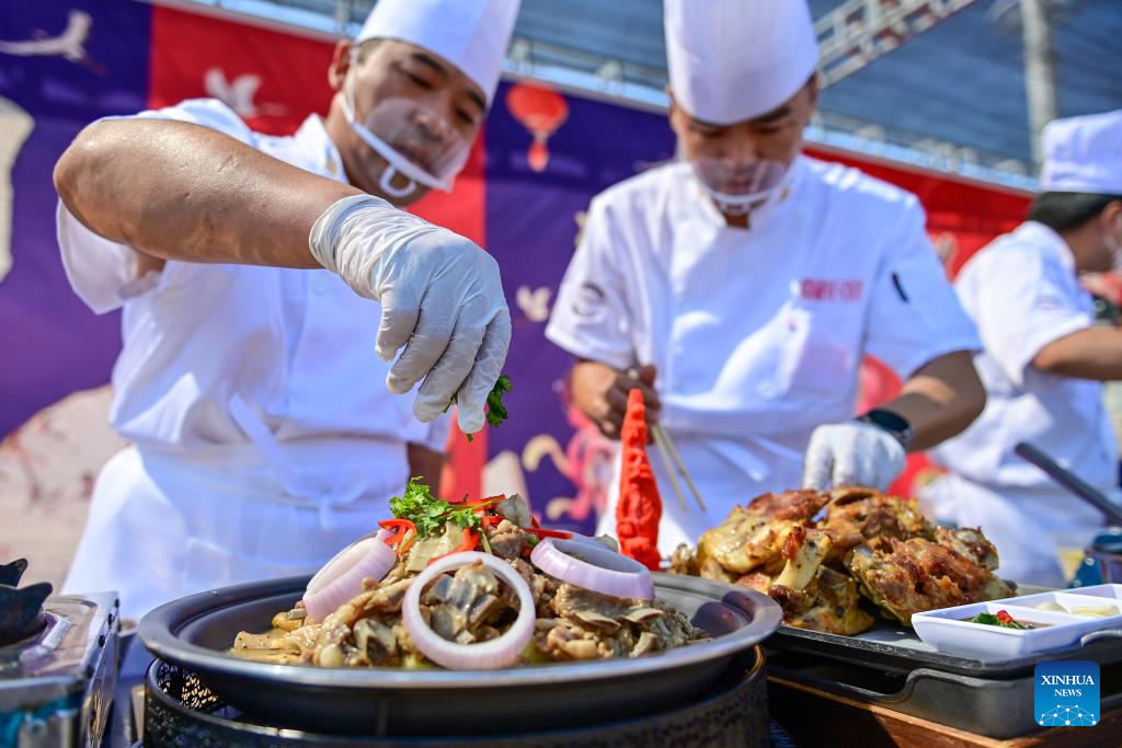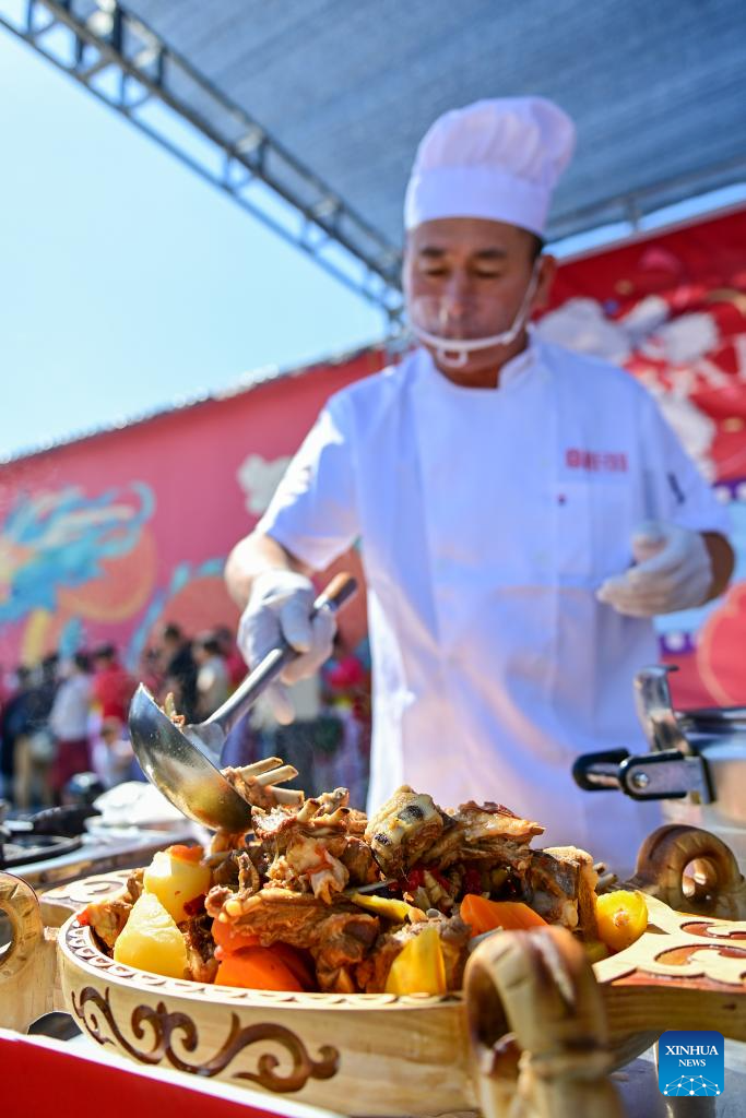 A chef prepares a dish during a lamb cooking contest in Yumin County of Tacheng Prefecture, northwest China's Xinjiang Uygur Autonomous Region, June 2, 2024. (Xinhua/Ding Lei)