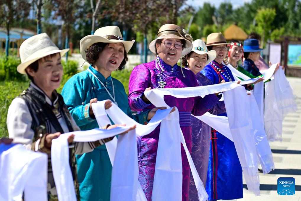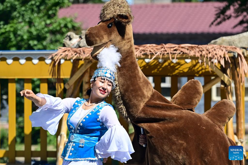 A local dancer greets tourists at Yuliu lane in Emin County, Tacheng Prefecture, northwest China's Xinjiang Uygur Autonomous Region, May 30, 2024. Xinjiang in northwest China has entered its peak tourism season recently. Emin County, located near the China-Kazakhstan border, is a popular tourist destination which provides various rural tour routes and cultural events. (Xinhua/Ding Lei)