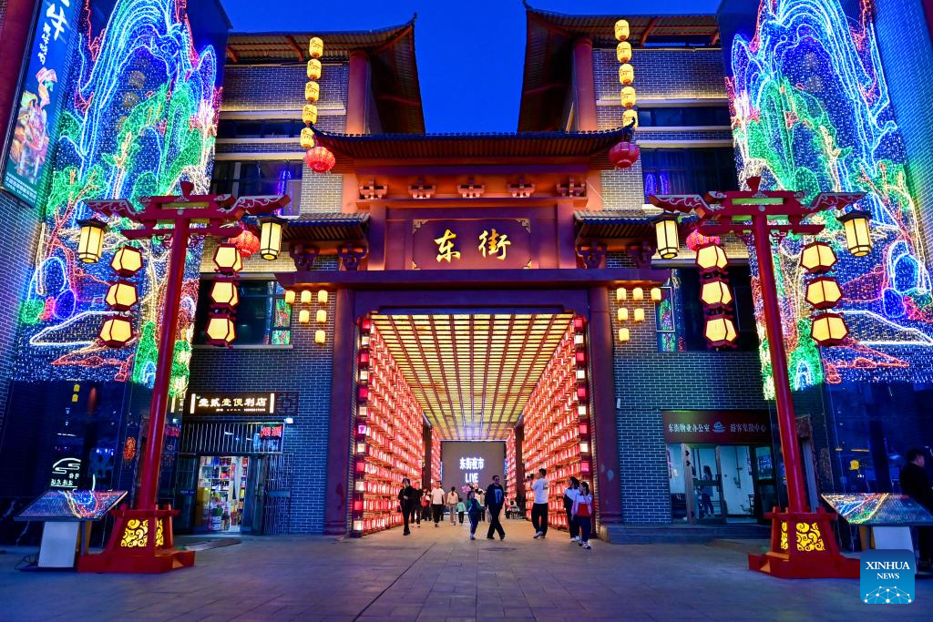People visit a night market in Emin County, Tacheng Prefecture, northwest China's Xinjiang Uygur Autonomous Region, May 29, 2024. Xinjiang in northwest China has entered its peak tourism season recently. Emin County, located near the China-Kazakhstan border, is a popular tourist destination which provides various rural tour routes and cultural events. (Xinhua/Ding Lei)