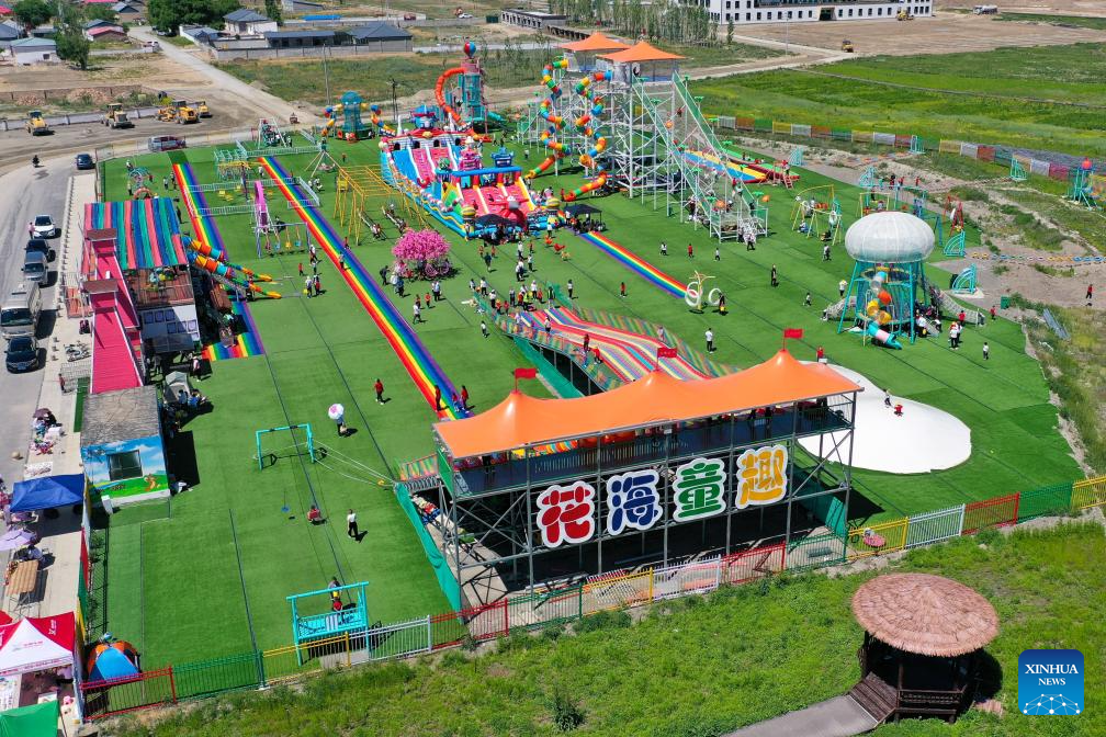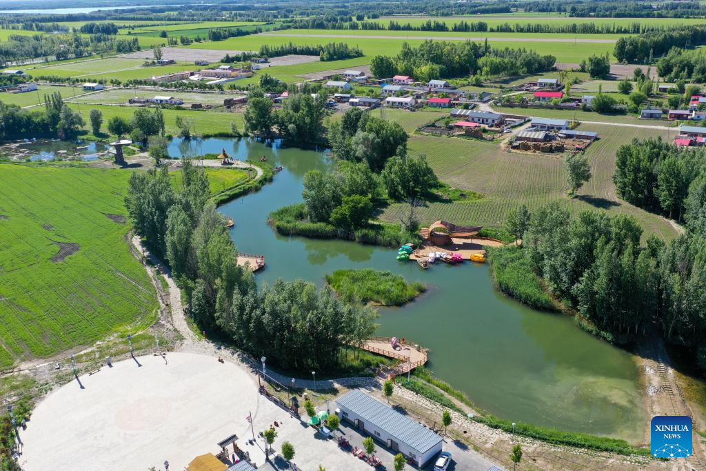 An aerial drone photo taken on May 30, 2024 shows a countryside amusement park in Emin County, Tacheng Prefecture, northwest China's Xinjiang Uygur Autonomous Region. Xinjiang in northwest China has entered its peak tourism season recently. Emin County, located near the China-Kazakhstan border, is a popular tourist destination which provides various rural tour routes and cultural events. (Xinhua/Ding Lei)