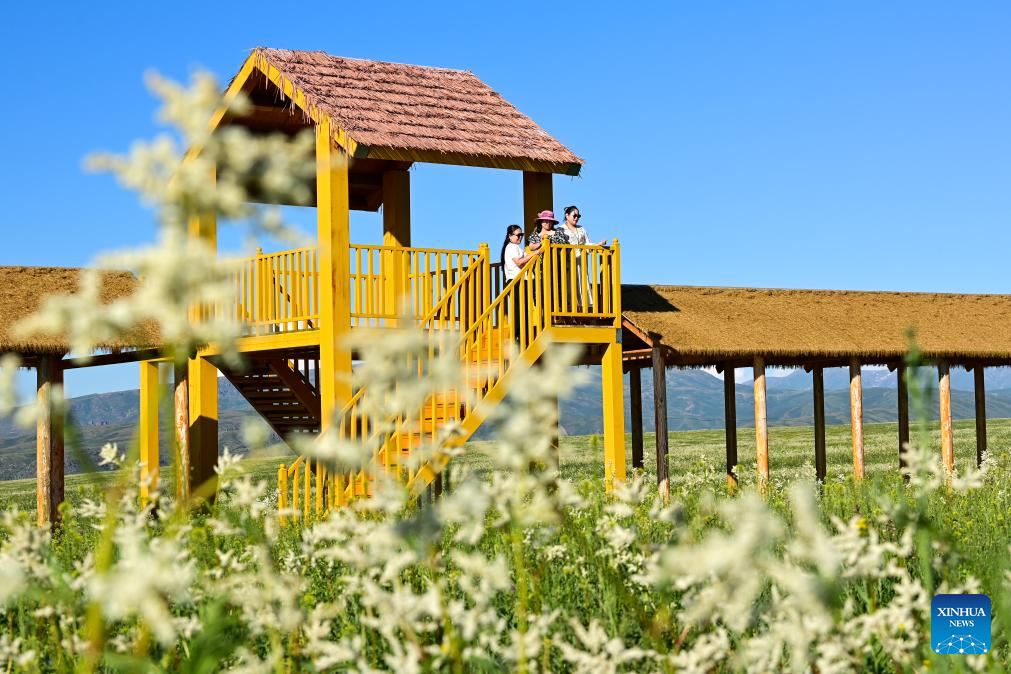 Tourists visit a grassland scenic spot in Emin County, Tacheng Prefecture, northwest China's Xinjiang Uygur Autonomous Region, May 30, 2024. Xinjiang in northwest China has entered its peak tourism season recently. Emin County, located near the China-Kazakhstan border, is a popular tourist destination which provides various rural tour routes and cultural events. (Xinhua/Ding Lei)