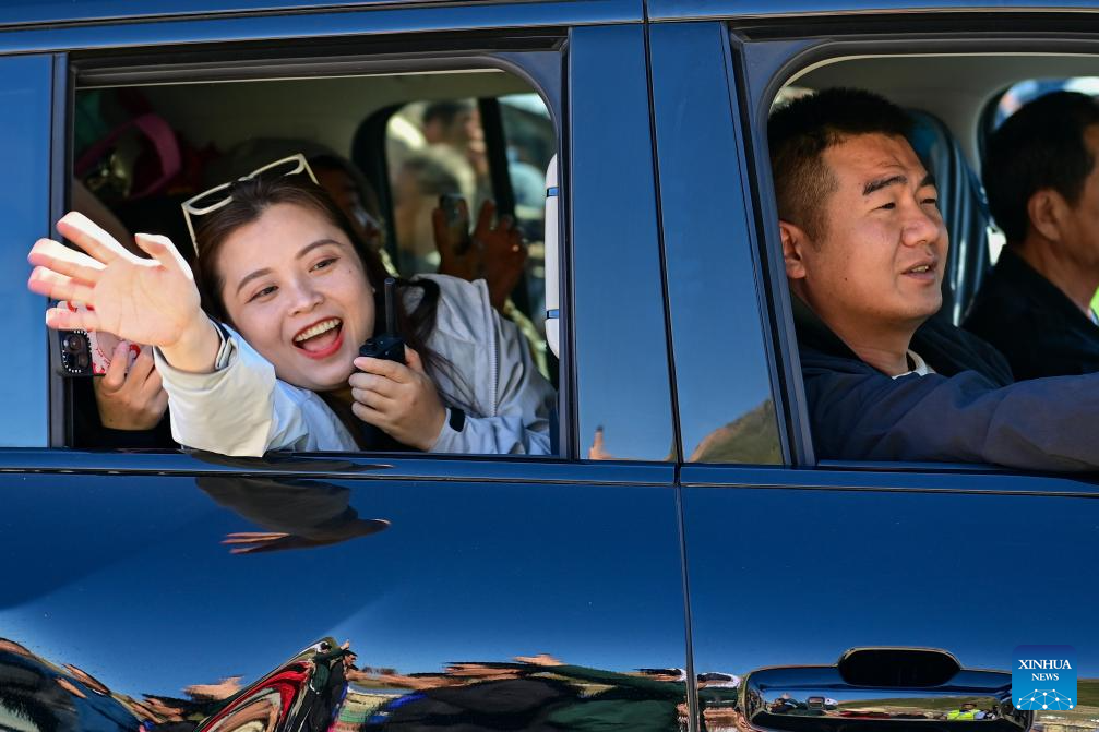 A tourist waves to local people at a service station along the Duku Highway in Usu City, northwest China's Xinjiang Uygur Autonomous Region, June 1, 2024. (Xinhua/Ding Lei)