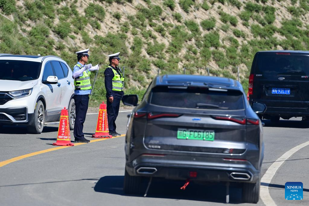 Traffic police are on duty at a service area along the Duku Highway in Usu City, northwest China's Xinjiang Uygur Autonomous Region, June 1, 2024. (Xinhua/Ding Lei)