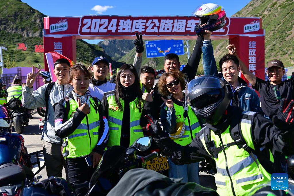 Motorcyclists pose for a group photo at a service area along the Duku Highway in Usu City, northwest China's Xinjiang Uygur Autonomous Region, June 1, 2024. (Xinhua/Ding Lei)