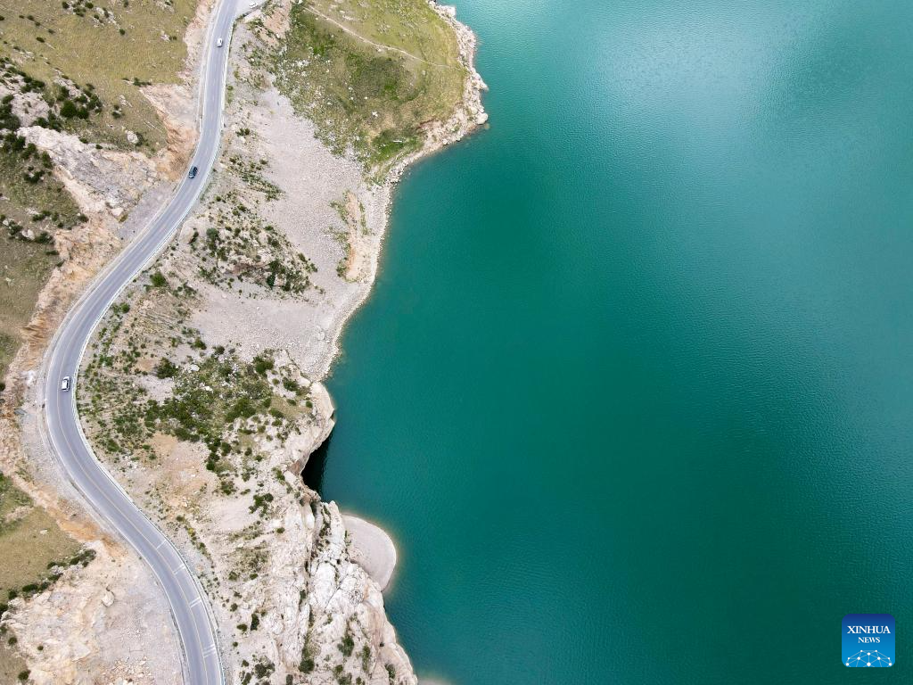 An aerial drone photo taken on Aug. 23, 2023 shows the view along the Duku Highway in northwest China's Xinjiang Uygur Autonomous Region. (Xinhua/Wang Peng)