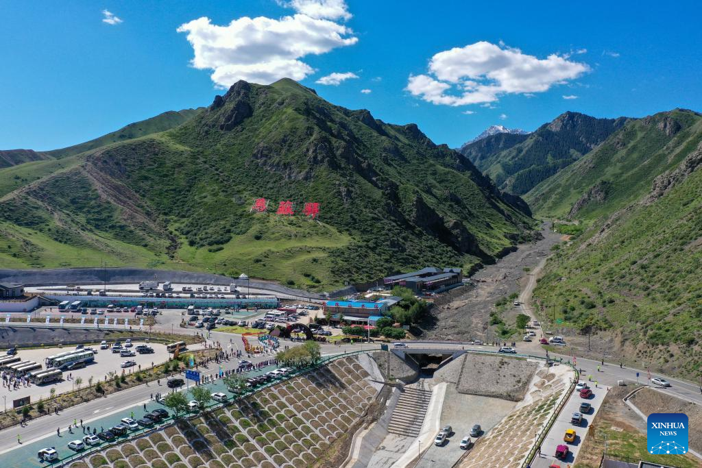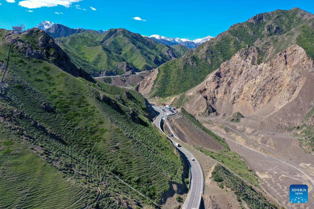 Aerial drone photo taken on June 20, 2021 shows cars moving along the Duku Highway in northwest China's Xinjiang Uygur Autonomous Region. (Xinhua/Gao Han)