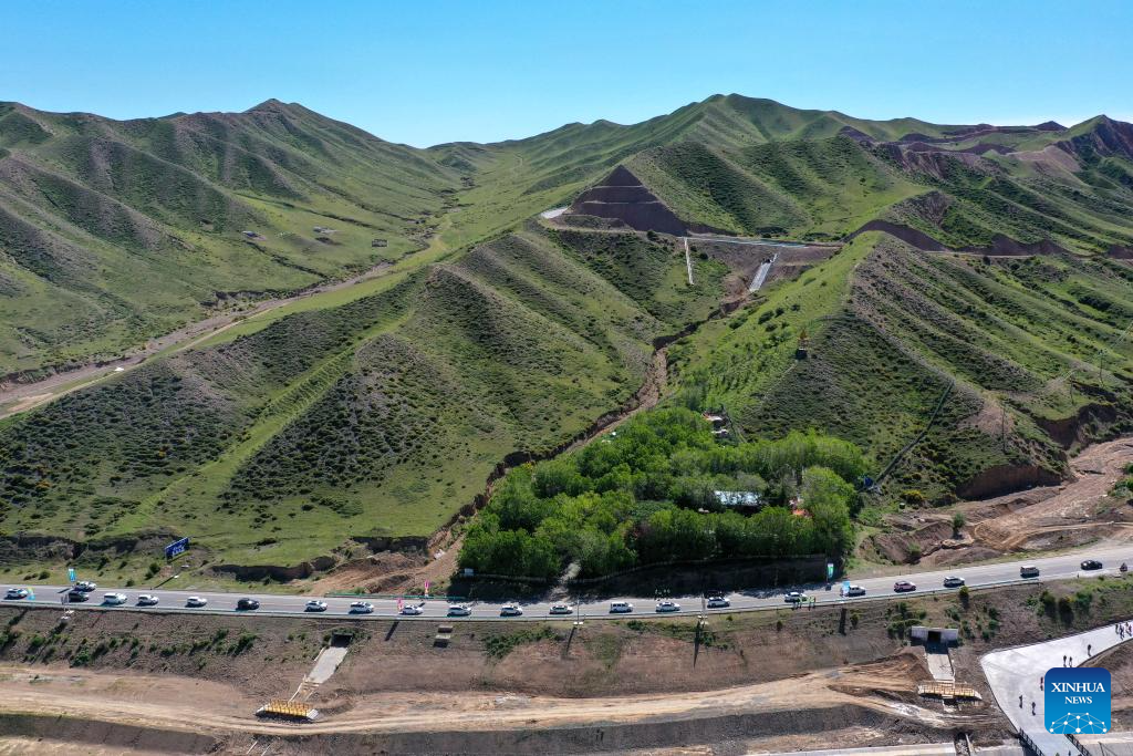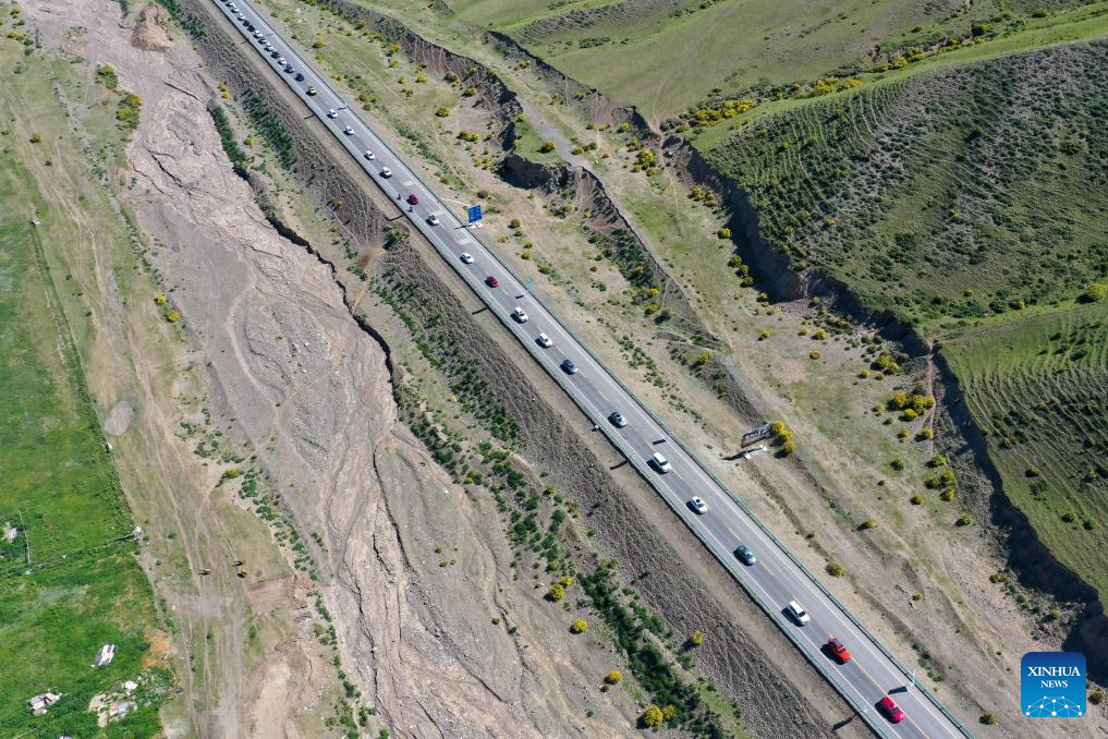 An aerial drone photo taken on June 1, 2024 shows vehicles setting off to the Duku Highway in Usu City, northwest China's Xinjiang Uygur Autonomous Region. (Xinhua/Ding Lei)