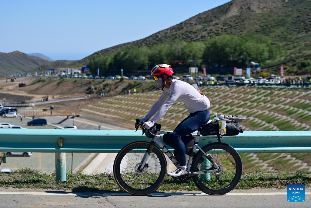 A cyclist rides a bike to the Duku Highway in Usu City, northwest China's Xinjiang Uygur Autonomous Region, June 1, 2024. (Xinhua/Ding Lei)