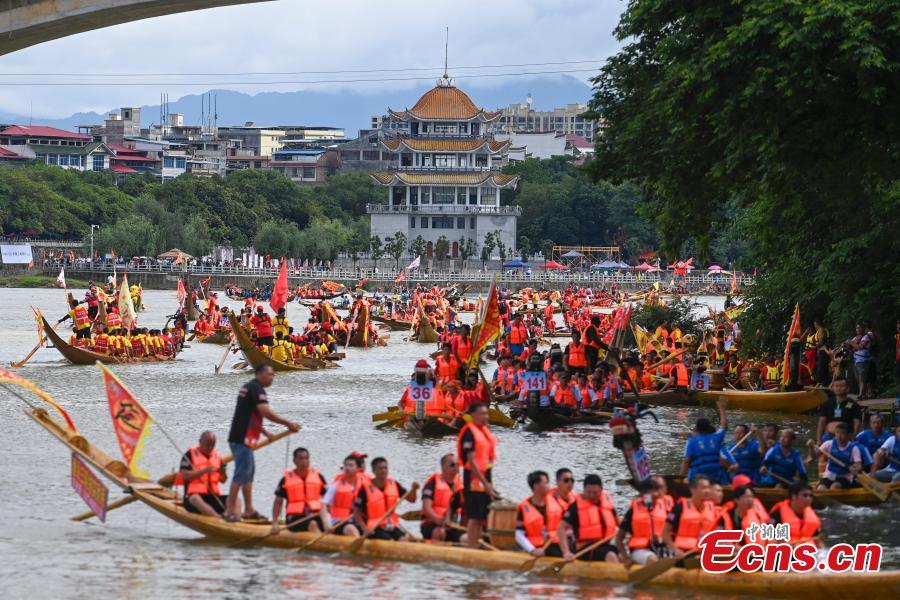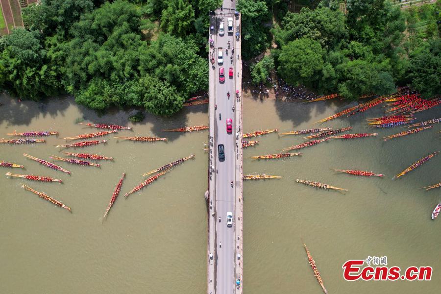 Dragon boats parade on Xiaoshui River to celebrate the upcoming Dragon Boat Festival in Dongxian County of Yongzhou City, central China's Hunan Province, June 2, 2024. (Photo: China News Service/Yang Huafeng)