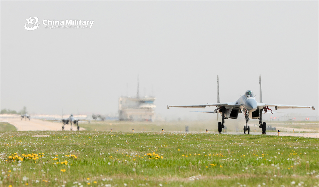 Fighter jets attached to a regiment under the PLA Naval Aviation University taxi on the runway during a multi-subject flight training exercise on May 9, 2024. (eng.chinamil.com.cn/Photo by Xu Yinglong)