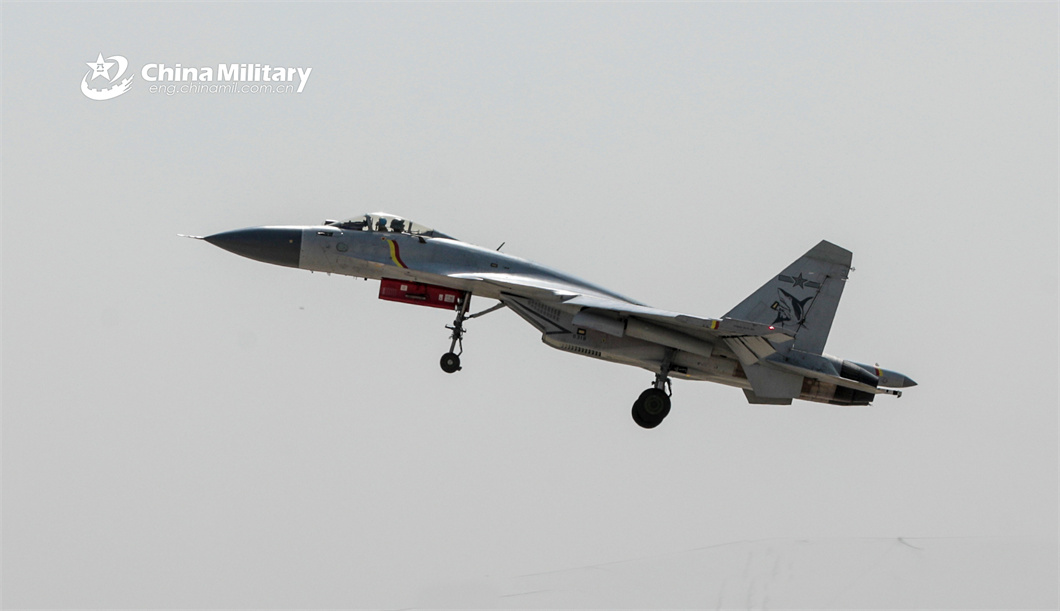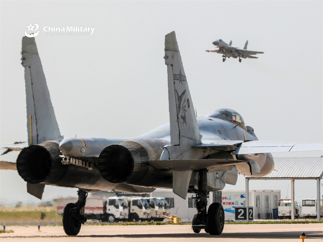 A J-15 carrier-based fighter jet attached to a regiment under the PLA Naval Aviation University takes off during a multi-subject flight training exercise on May 9, 2024. (eng.chinamil.com.cn/Photo by Xu Yinglong)