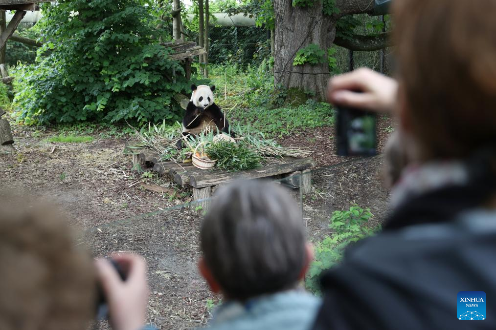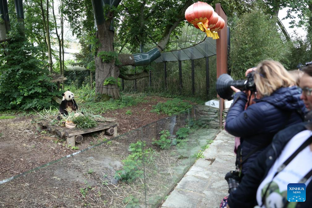 People take photos of giant panda Tian Bao at the Pairi Daiza Zoo in Brugelette, Belgium, June 2, 2024. The Belgian Pairi Daiza Zoo celebrated the 8th birthday of giant panda Tian Bao on Sunday. (Xinhua/Zhao Dingzhe)