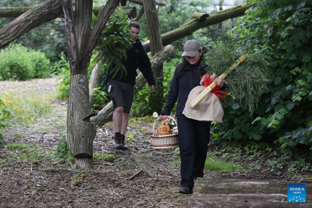 Breeders prepare a birthday meal for giant panda Tian Bao at the Pairi Daiza Zoo in Brugelette, Belgium, June 2, 2024. The Belgian Pairi Daiza Zoo celebrated the 8th birthday of giant panda Tian Bao on Sunday. (Xinhua/Zhao Dingzhe)