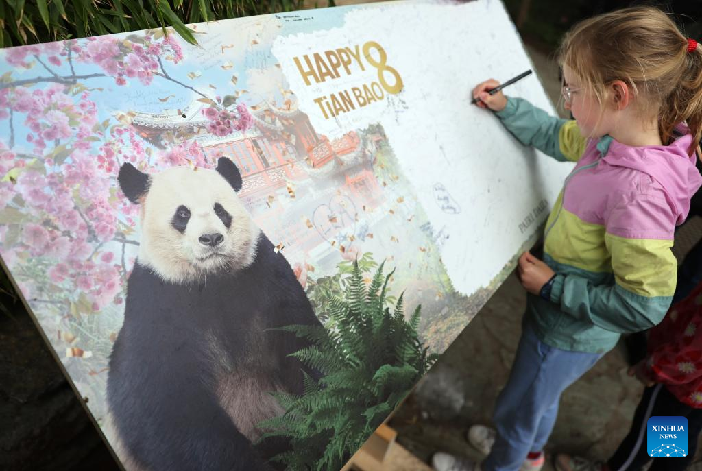 A girl writes her birthday wish for giant panda Tian Bao at the Pairi Daiza Zoo in Brugelette, Belgium, June 2, 2024. The Belgian Pairi Daiza Zoo celebrated the 8th birthday of giant panda Tian Bao on Sunday. (Xinhua/Zhao Dingzhe)