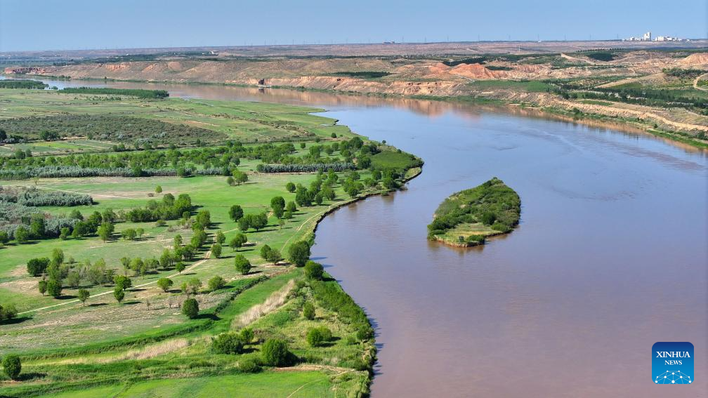 An aerial drone photo taken on May 30, 2024 shows a section of the Yellow River in Yinchuan, northwest China's Ningxia Hui Autonomous Region. The Yellow River, China's second-largest river after the Yangtze, is dubbed the "mother river." In recent years, continued efforts have been made to protect its ecology, as vitality has returned to the Yellow River basin in Ningxia. (Xinhua/Wang Peng)
