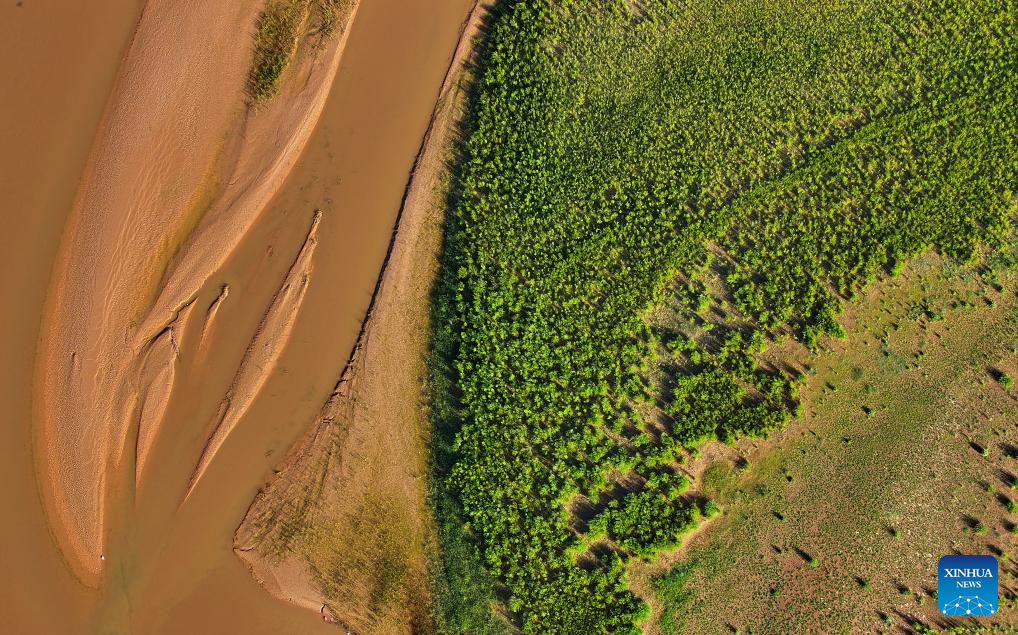 An aerial drone photo taken on May 30, 2024 shows the mudflats of the Yellow River in Yinchuan, northwest China's Ningxia Hui Autonomous Region. The Yellow River, China's second-largest river after the Yangtze, is dubbed the "mother river." In recent years, continued efforts have been made to protect its ecology, as vitality has returned to the Yellow River basin in Ningxia. (Xinhua/Wang Peng)