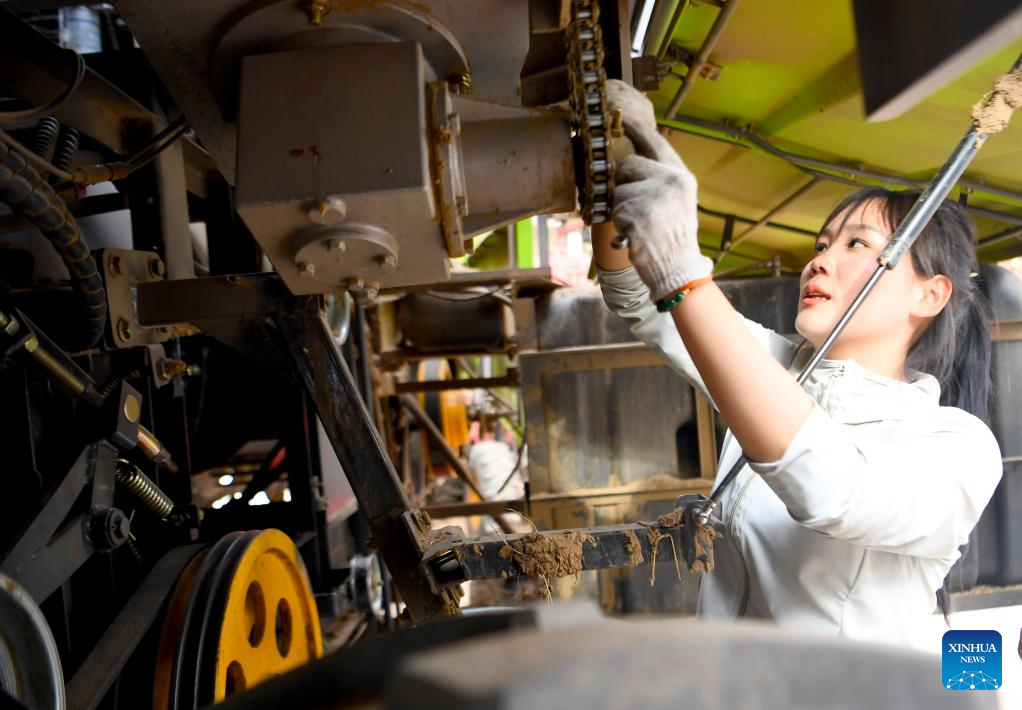 Du Mengyuan maintains a combine harvester in Guanmiaodu Village of Lushan County in Pingdingshan City, central China's Henan Province, May 30, 2024. (Xinhua/Hao Yuan)