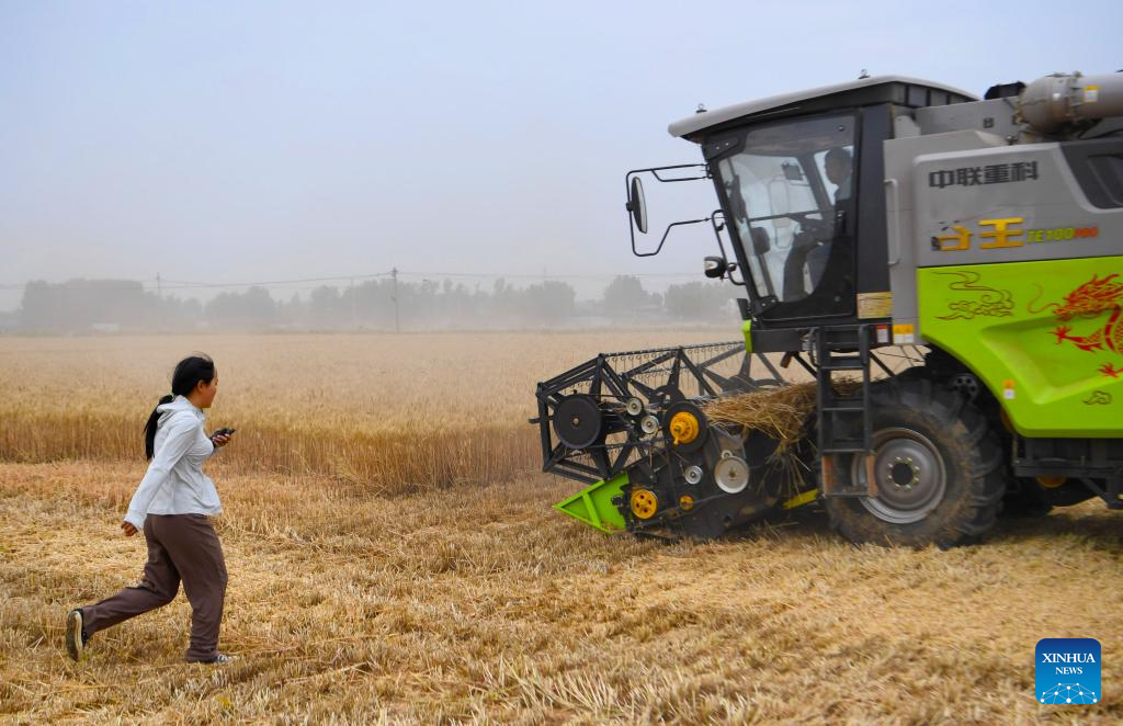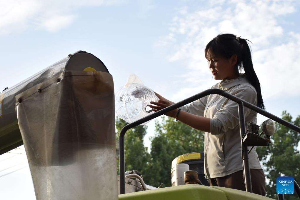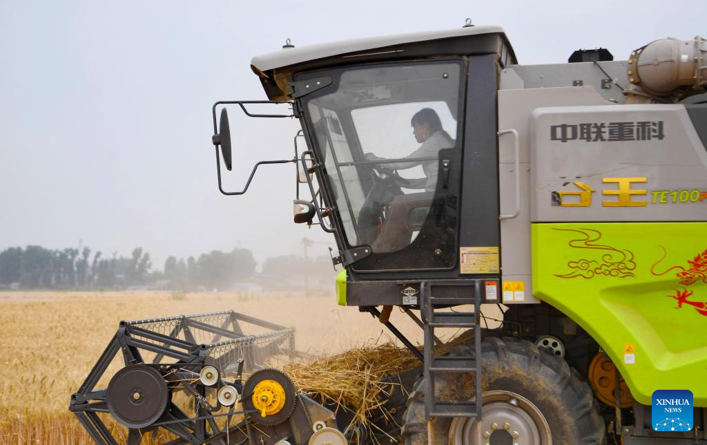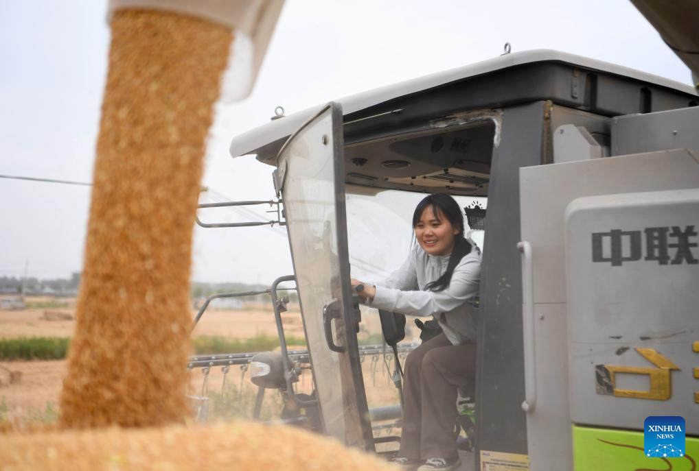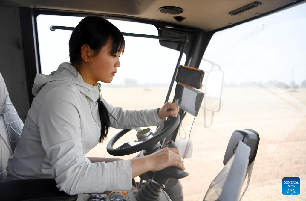 Du Mengyuan operates a combine harvester through the wheat fields in Guanmiaodu Village of Lushan County in Pingdingshan City, central China's Henan Province, May 29, 2024. (Xinhua/Hao Yuan)
