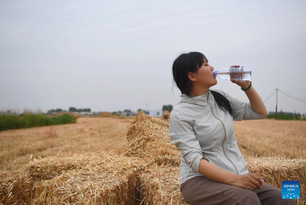 Du Mengyuan drinks water during a break of wheat harvest in Guanmiaodu Village of Lushan County in Pingdingshan City, central China's Henan Province, May 29, 2024. (Xinhua/Hao Yuan)
