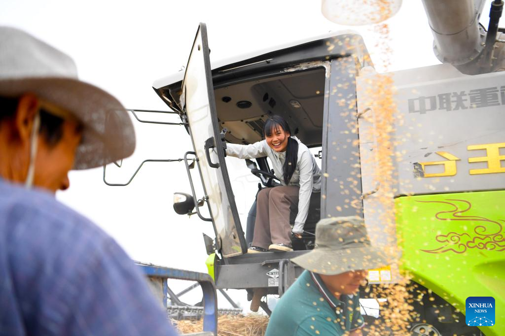 Amidst the golden waves of wheat and the roar of machinery, 22-year-old Du Mengyuan, a female machine operator, skillfully maneuvers a combine harvester through the fields.