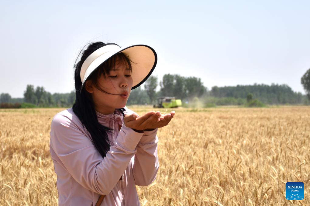 Du Mengyuan checks wheat in the fields in Quxing Township in Kaifeng City, central China's Henan Province, May 31, 2024. (Xinhua/Gao Songling)