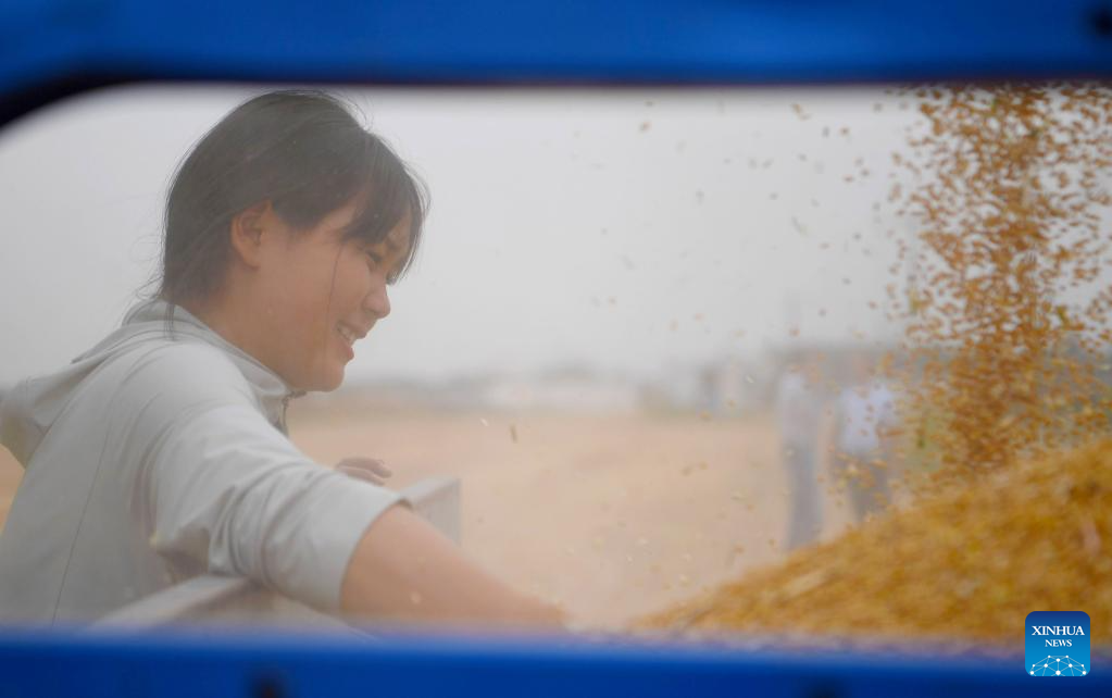 Du Mengyuan operates a combine harvester to load wheat in Guanmiaodu Village of Lushan County in Pingdingshan City, central China's Henan Province, May 29, 2024. (Xinhua/Hao Yuan)