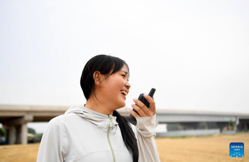 Du Mengyuan uses a walkie-talkie to communicate with her father among wheat fields in Guanmiaodu Village of Lushan County in Pingdingshan City, central China's Henan Province, May 29, 2024. (Xinhua/Hao Yuan)