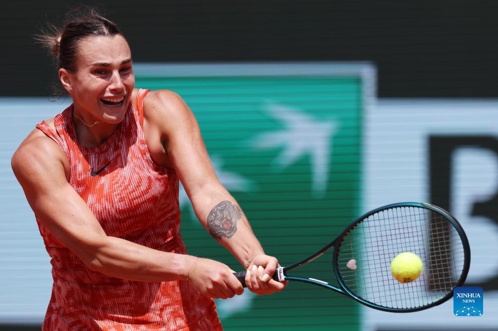 Aryna Sabalenka hits a return during the women's singles round of 16 match between Aryna Sabalenka of Belarus and Emma Navarro of the United States at the French tennis tournament in Paris, France, June 3, 2024. (Xinhua/Gao Jing)