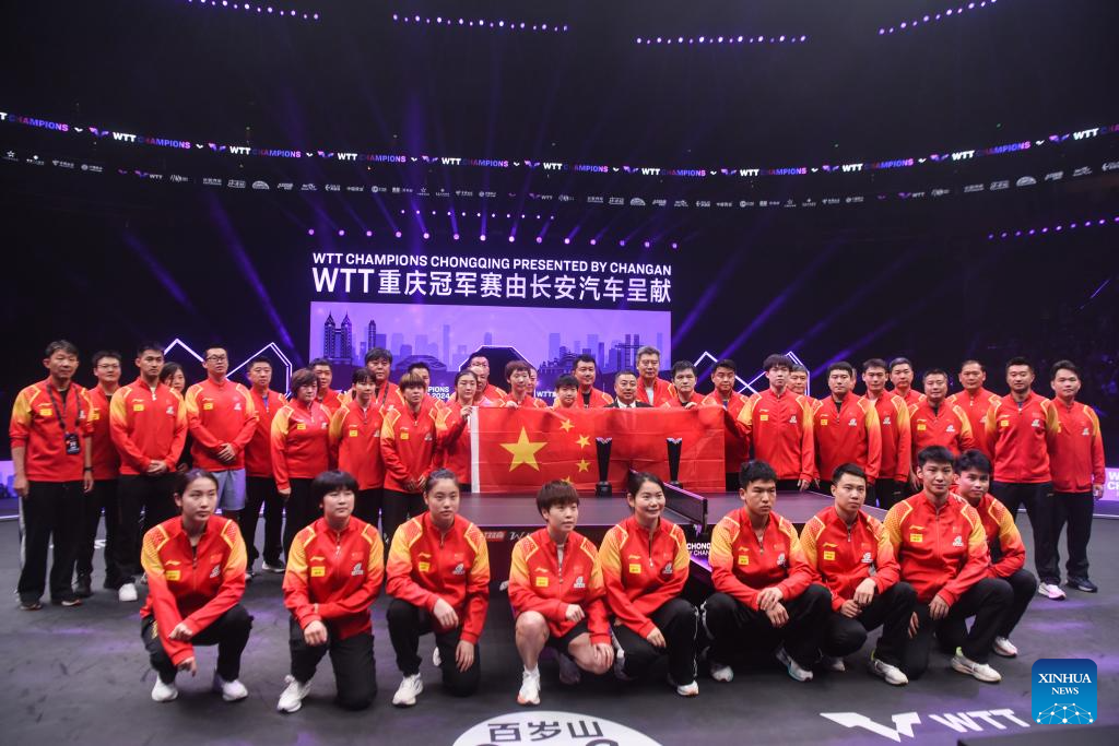 Team China pose for photos after the awarding ceremony of the WTT Champions Chongqing 2024 in southwest China's Chongqing, June 3, 2024. (Xinhua/Zhang Ziyu)