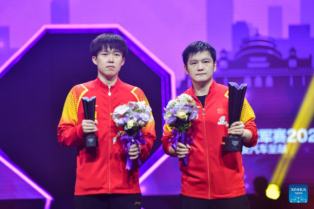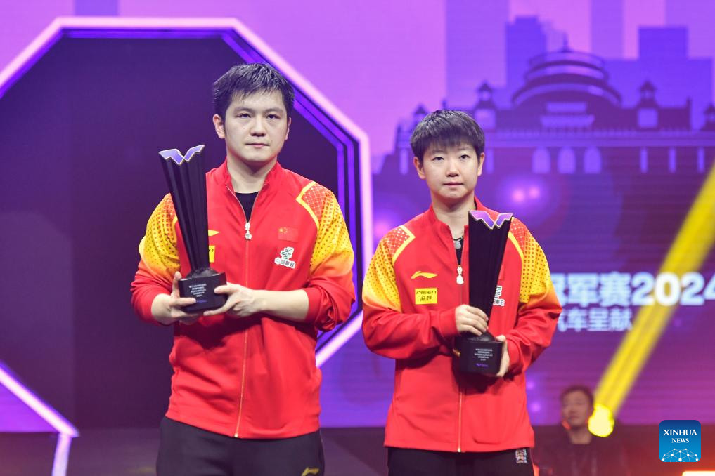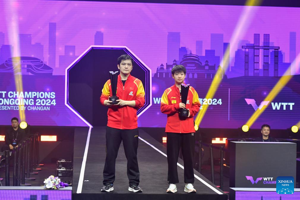 Gold medalist of men's singles Fan Zhendong (L) of China and gold medalist of women's singles Sun Yingsha of China pose during the awarding ceremony of the WTT Champions Chongqing 2024 in southwest China's Chongqing, June 3, 2024. (Xinhua/Zhang Ziyu)