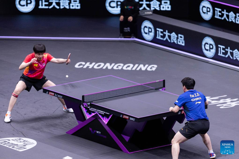 Wang Chuqin (L) hits a return during the men's singles final between Wang Chuqin of China and Fan Zhendong of China at the WTT Champions Chongqing 2024 in southwest China's Chongqing, June 3, 2024. (Xinhua/Huang Wei)
