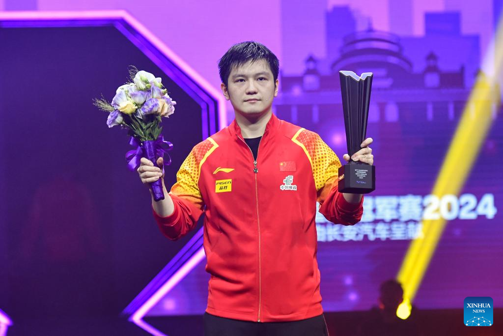 Gold medalist Fan Zhendong of China reacts during the awarding ceremony of the men's singles at the WTT Champions Chongqing 2024 in southwest China's Chongqing, June 3, 2024. (Xinhua/Zhang Ziyu)