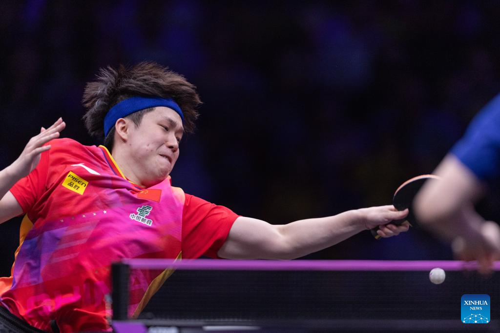 Wang Chuqin hits a return during the men's singles final between Wang Chuqin of China and Fan Zhendong of China at the WTT Champions Chongqing 2024 in southwest China's Chongqing, June 3, 2024. (Xinhua/Huang Wei)