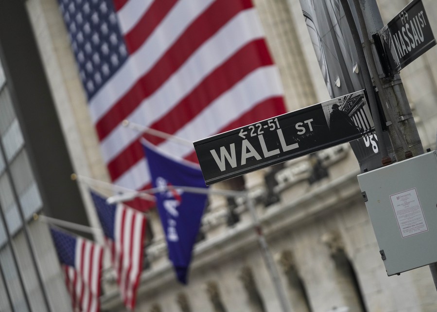 A road sign is seen nearby the New York Stock Exchange in New York, the United States. (Xinhua/Wang Ying)
