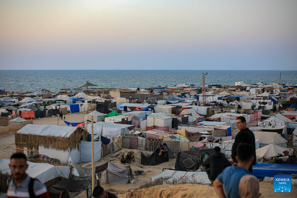 People are silhouetted against sunset above temporary tents for displaced Palestinians in the Mawasi area in the southern Gaza Strip city of Khan Younis, on June 4, 2024. On May 7, the Israeli army expanded its military operation in Rafah, ordering more than 1.5 million Palestinians sheltering there to head to Khan Younis and other central areas of Gaza. (Photo by Rizek Abdeljawad/Xinhua)
