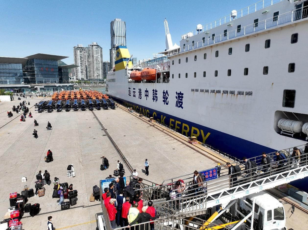 Chinese and foreign tourists disembark from a ferry at an international passenger terminal in Lianyungang, east China's Jiangsu province, on May 16, 2024. (People's Daily Online/Wang Chun)