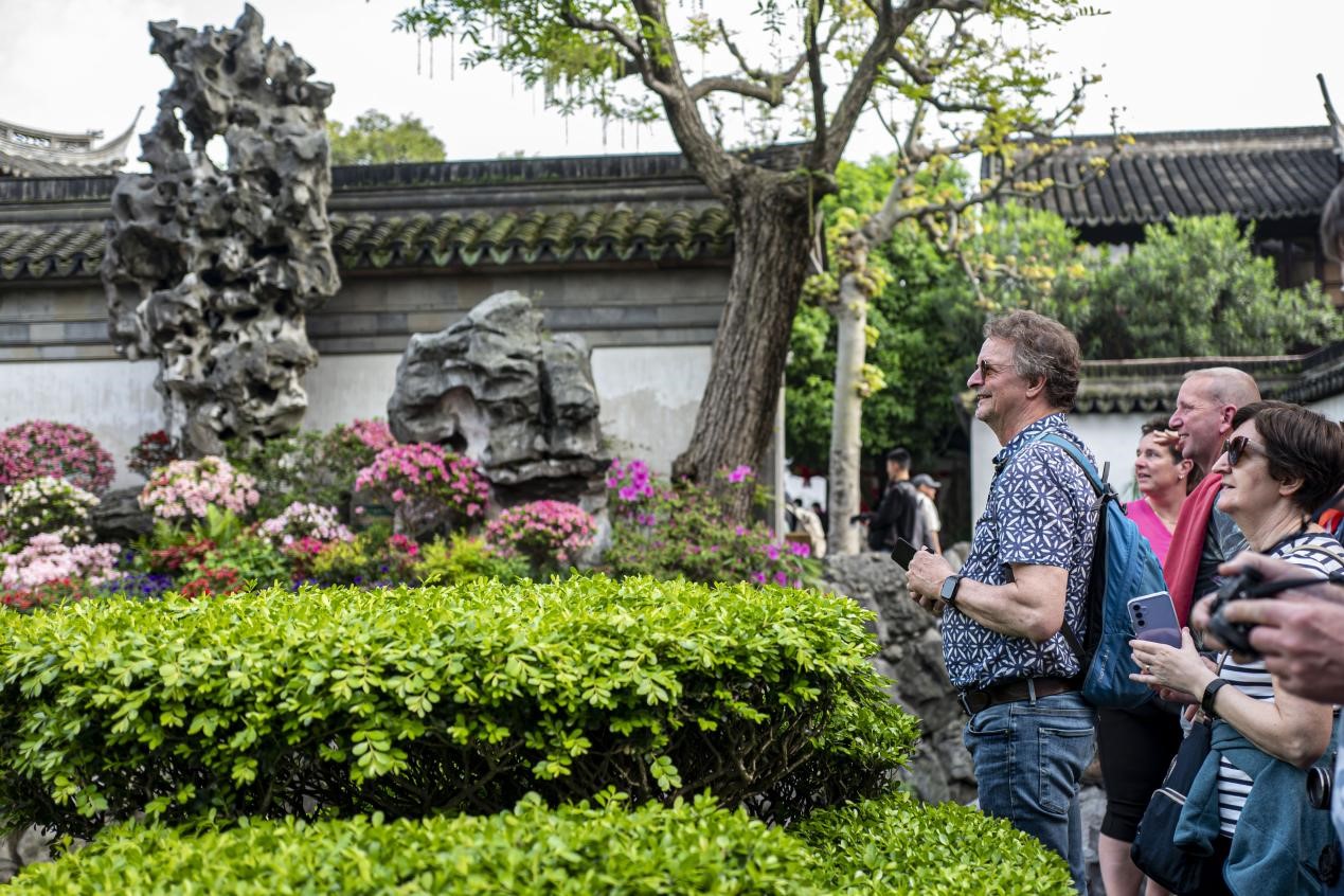 Foreign tourists visit the Yuyuan Garden in Shanghai, on April 23, 2024. (People's Daily Online/Wang Chu)
