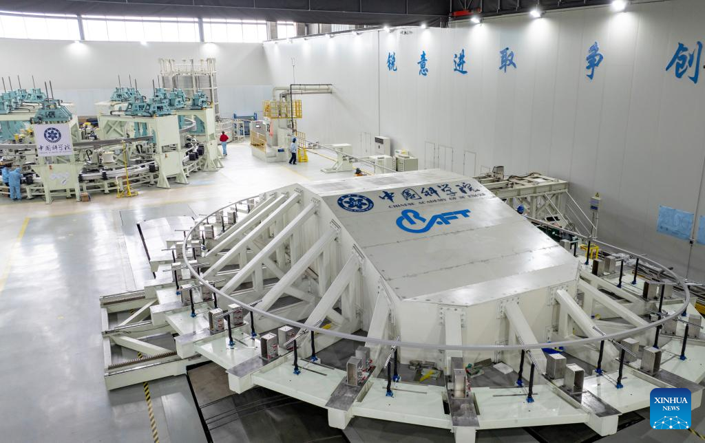 A drone photo taken on May 27, 2024 shows the superconducting toroidal field coil winding line at the park of Comprehensive Research Facility for Fusion Technology (CRAFT) in Hefei, east China's Anhui Province. (Photo by Zhao Xianfu/Xinhua)
