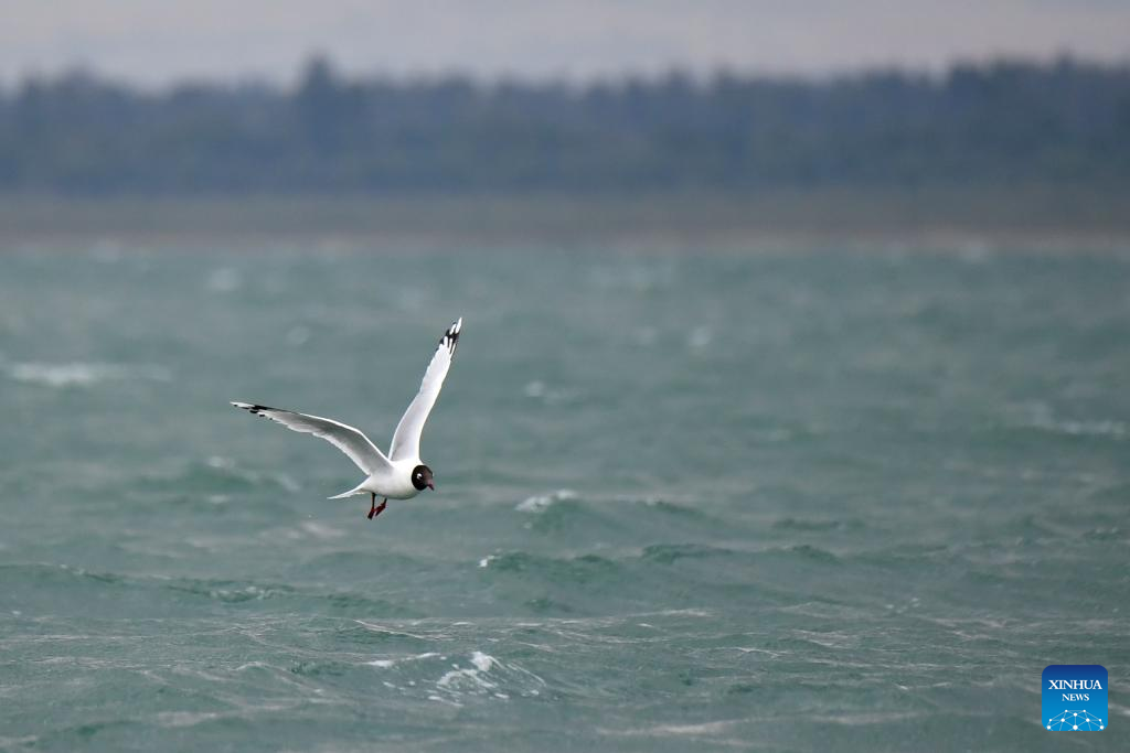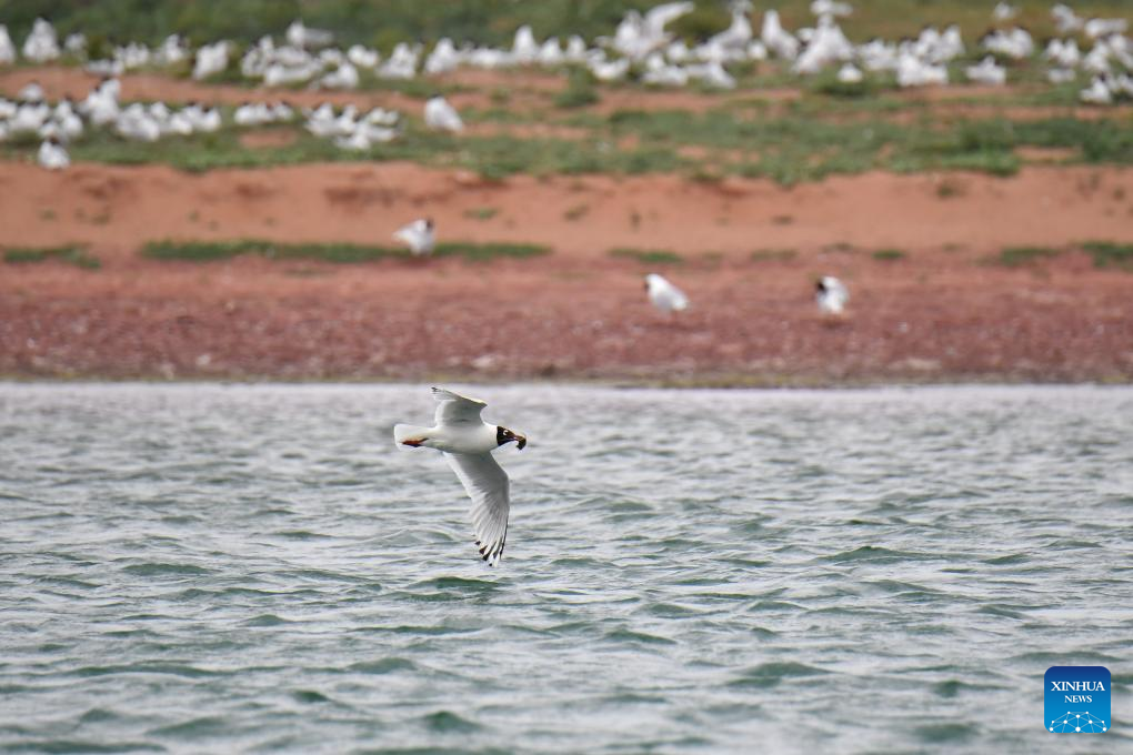 This photo taken on June 4, 2024 shows a relict gull flying at Hongjiannao National Nature Reserve in Shenmu, northwest China's Shaanxi Province. At present, nearly 5,000 nests of relict gulls have entered the incubation and brooding period in the Hongjiannao Lake, China's largest desert freshwater lake. After years of treatment, the lake has regained vitality and has become an important habitat and breeding place for relict gull, which is under first-class national protection in China. (Xinhua/Shao Rui)