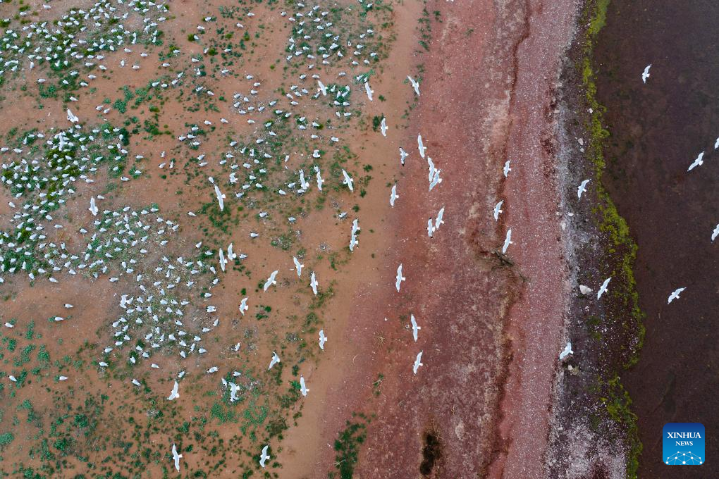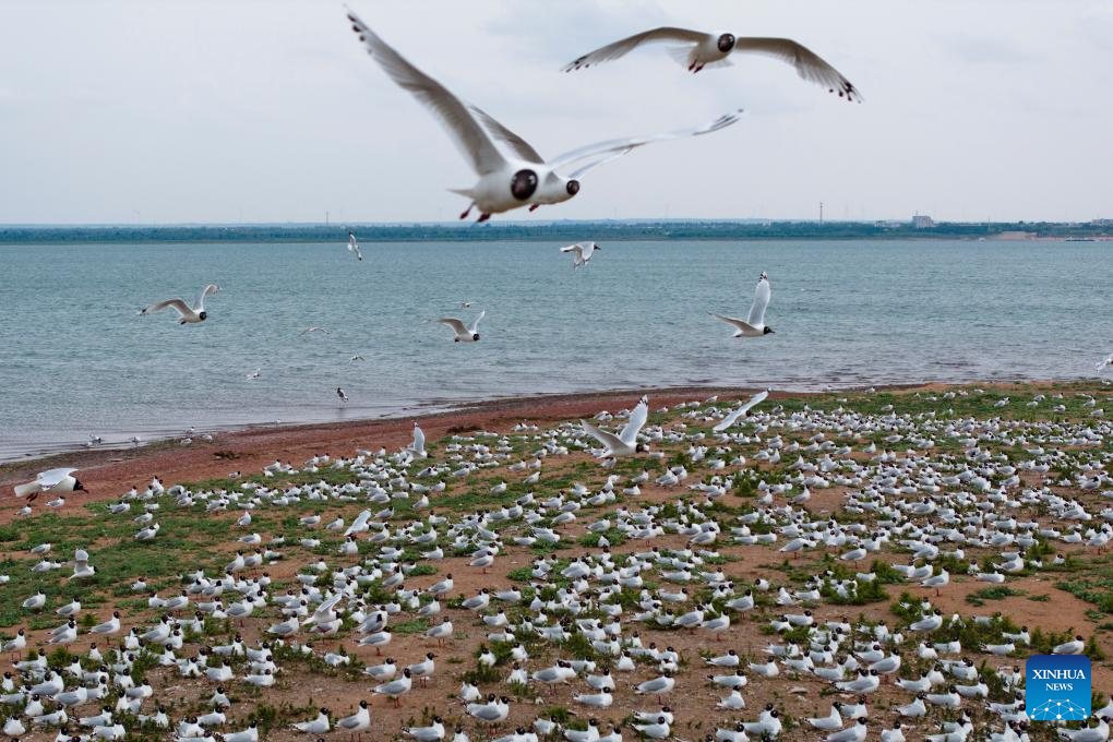An aerial drone photo taken on June 4, 2024 shows relict gulls at Hongjiannao National Nature Reserve in Shenmu, northwest China's Shaanxi Province. At present, nearly 5,000 nests of relict gulls have entered the incubation and brooding period in the Hongjiannao Lake, China's largest desert freshwater lake. After years of treatment, the lake has regained vitality and has become an important habitat and breeding place for relict gull, which is under first-class national protection in China. (Xinhua/Shao Rui)