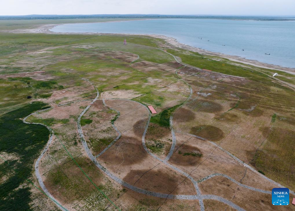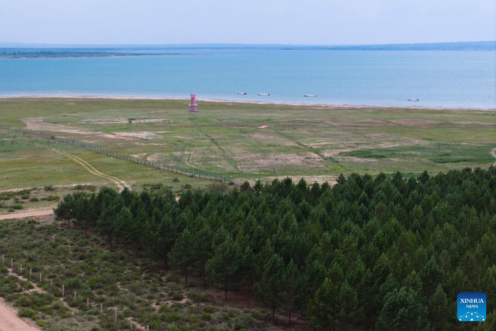 An aerial drone photo taken on June 4, 2024 shows a restoration program for degraded grassland in Hongjiannao National Nature Reserve in Shenmu, northwest China's Shaanxi Province. At present, nearly 5,000 nests of relict gulls have entered the incubation and brooding period in the Hongjiannao Lake, China's largest desert freshwater lake. After years of treatment, the lake has regained vitality and has become an important habitat and breeding place for relict gull, which is under first-class national protection in China. (Xinhua/Shao Rui)