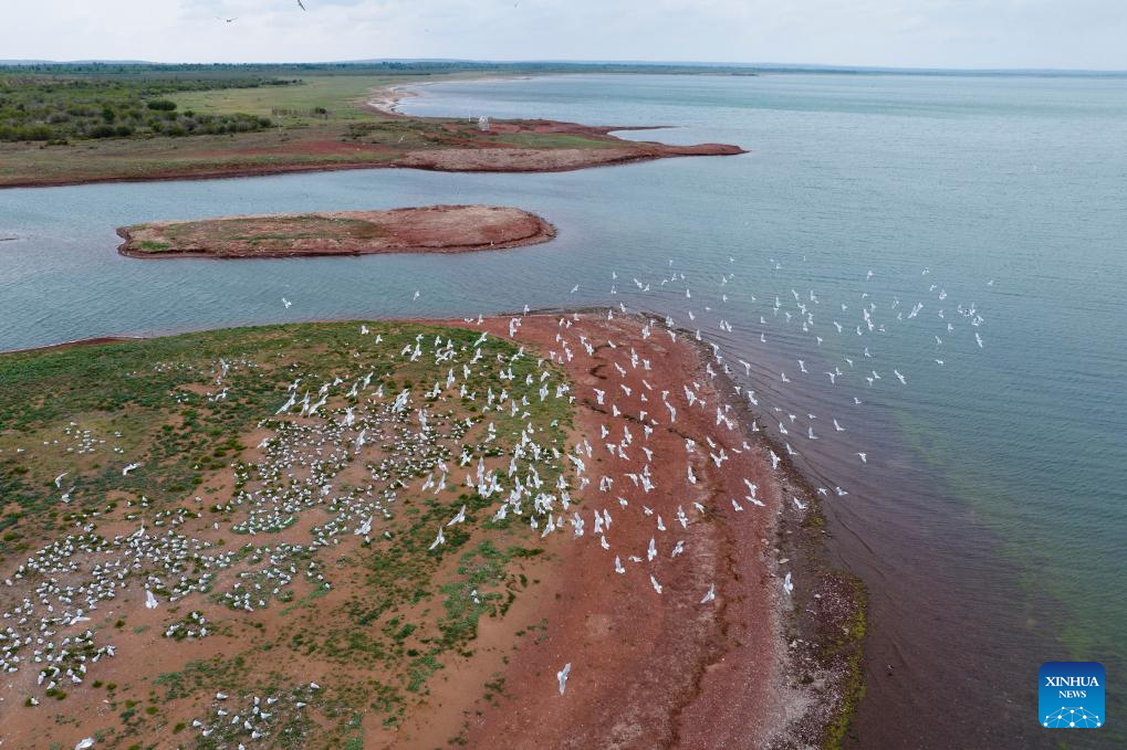 An aerial drone photo taken on June 4, 2024 shows a view in Hongjiannao National Nature Reserve in Shenmu, northwest China's Shaanxi Province. At present, nearly 5,000 nests of relict gulls have entered the incubation and brooding period in the Hongjiannao Lake, China's largest desert freshwater lake. After years of treatment, the lake has regained vitality and has become an important habitat and breeding place for relict gull, which is under first-class national protection in China. (Xinhua/Shao Rui)