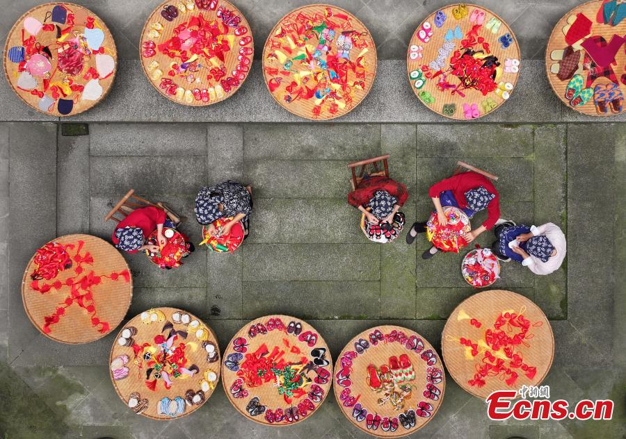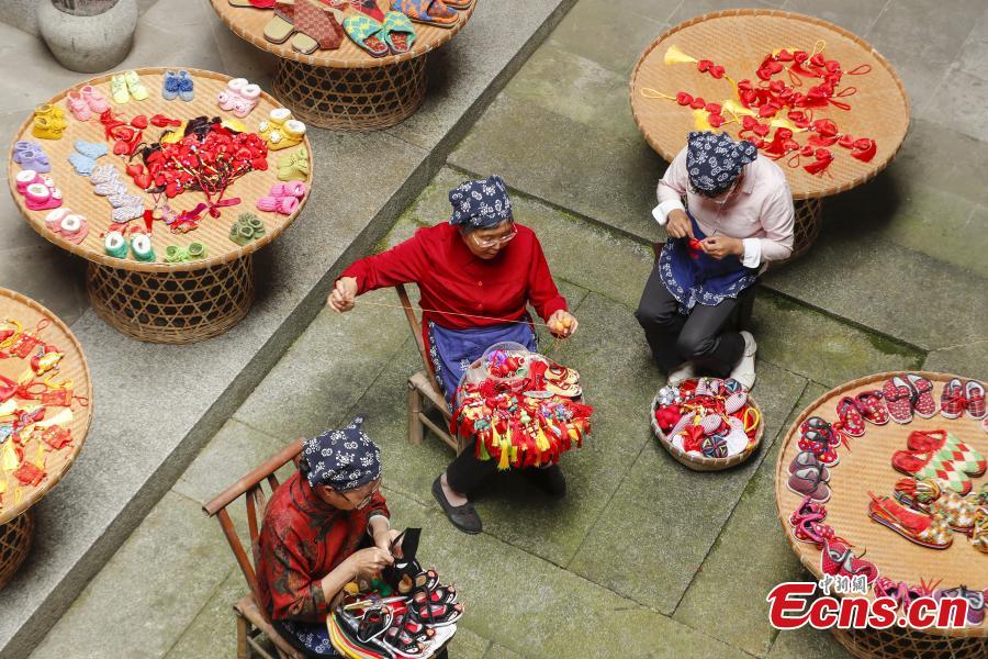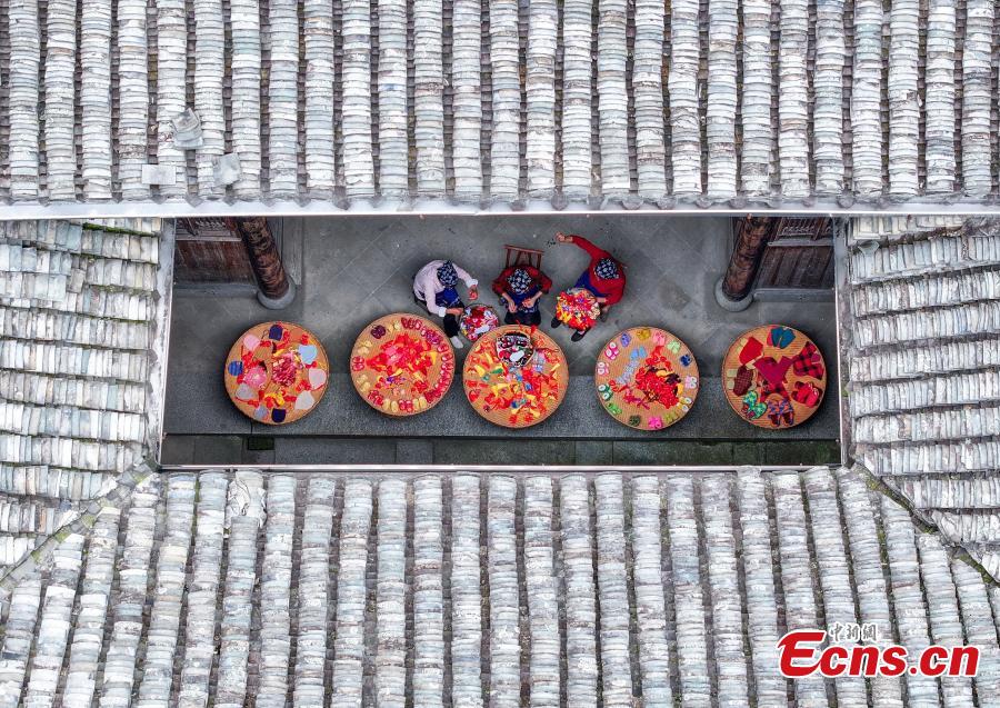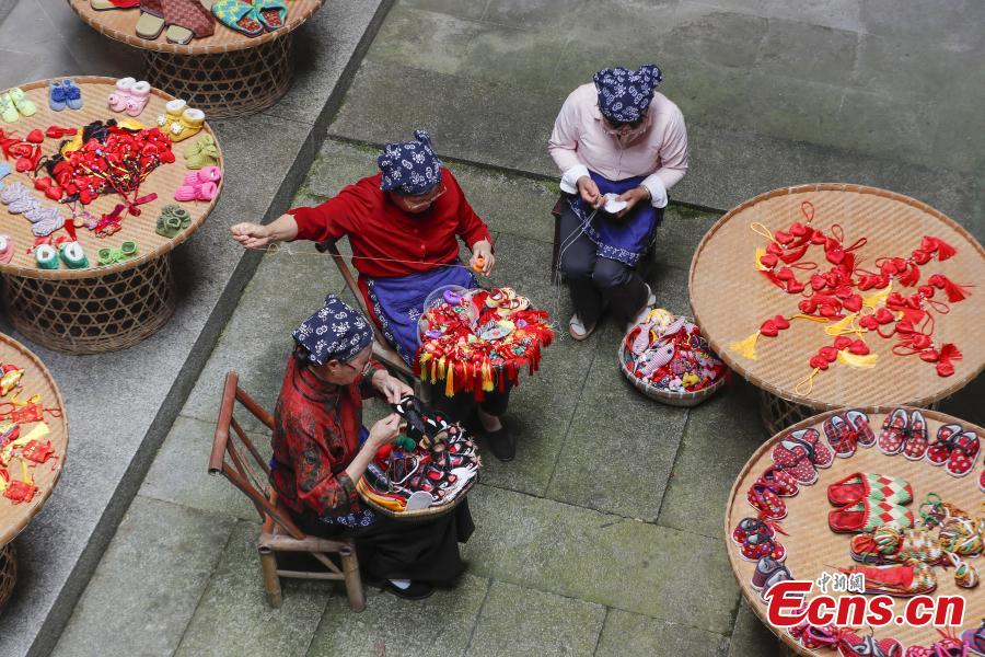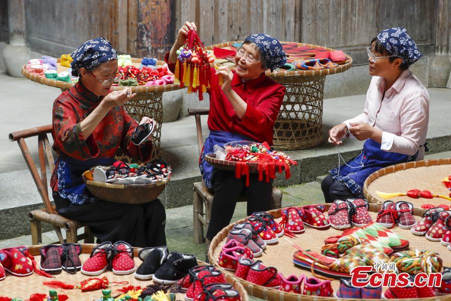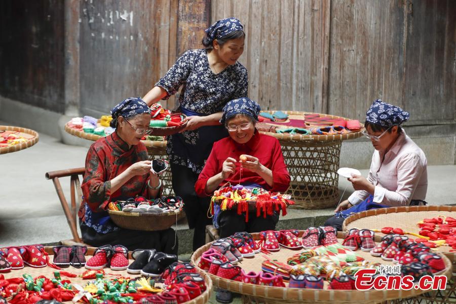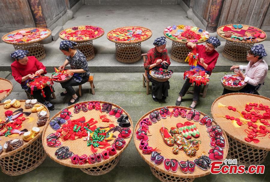 Villagers weave colorful sachets made of Huizhou brocade, an intangible cultural heritage, as the Dragon Boat Festival approaches, in Shexian County of Huangshan City, east China's Anhui Province, June 4, 2024. (Photo: China News Service/Shi Yalei)
