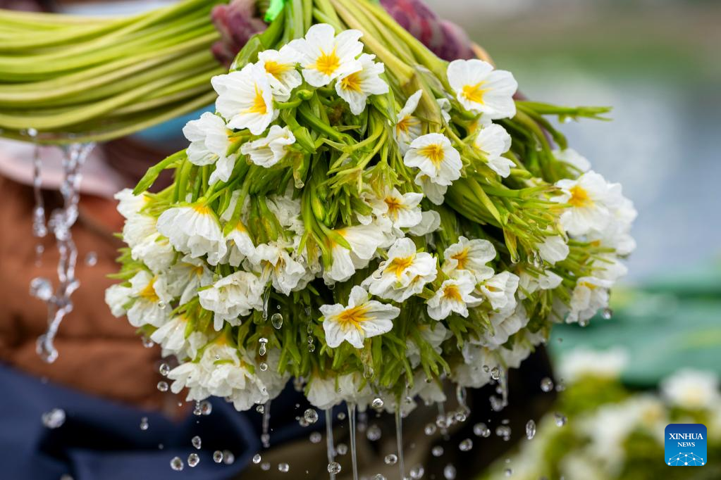 Newly harvested ottelia acuminata flowers are pictured at an ottelia acuminata planting base in Eryuan County of Dali Bai Autonomous Prefecture, southwest China's Yunnan Province on June 5, 2024. Ottelia acuminata only lives in fresh water of high quality, and is viewed as an indicator species of the natural environment. Its flowers are taken as an important food ingredient for people of the Bai ethnic group in southwest China. (Photo by Luo Xincai/Xinhua)
