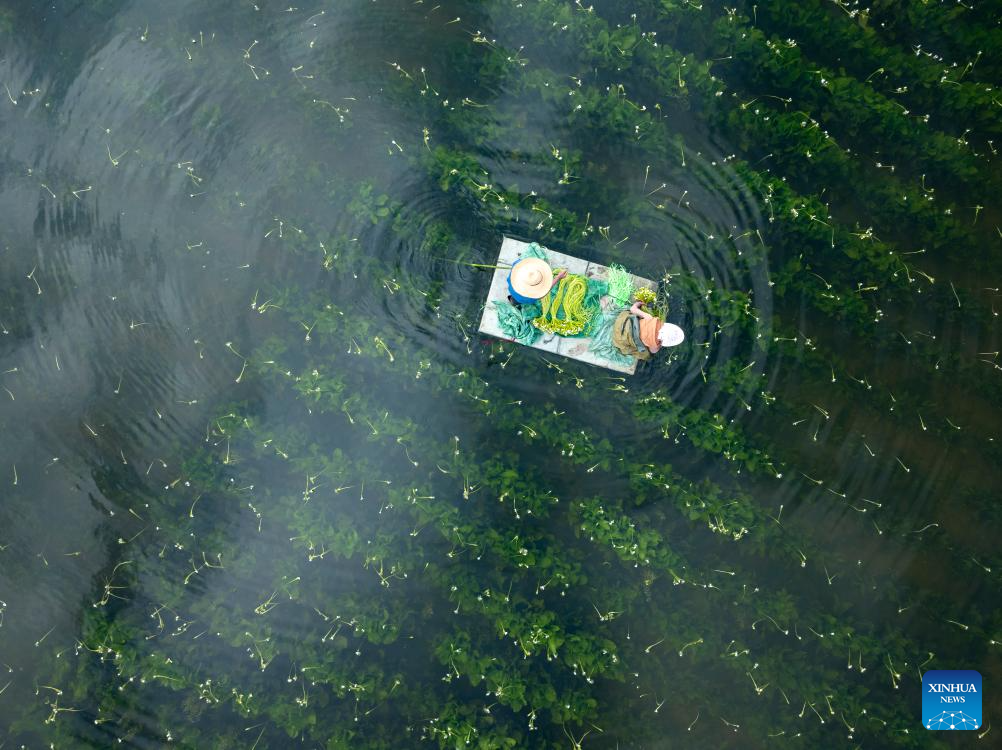 A drone photo taken on June 5, 2024 shows villagers harvesting ottelia acuminata flowers at an ottelia acuminata planting base in Eryuan County of Dali Bai Autonomous Prefecture, southwest China's Yunnan Province. Ottelia acuminata only lives in fresh water of high quality, and is viewed as an indicator species of the natural environment. Its flowers are taken as an important food ingredient for people of the Bai ethnic group in southwest China. (Photo by Luo Xincai/Xinhua)