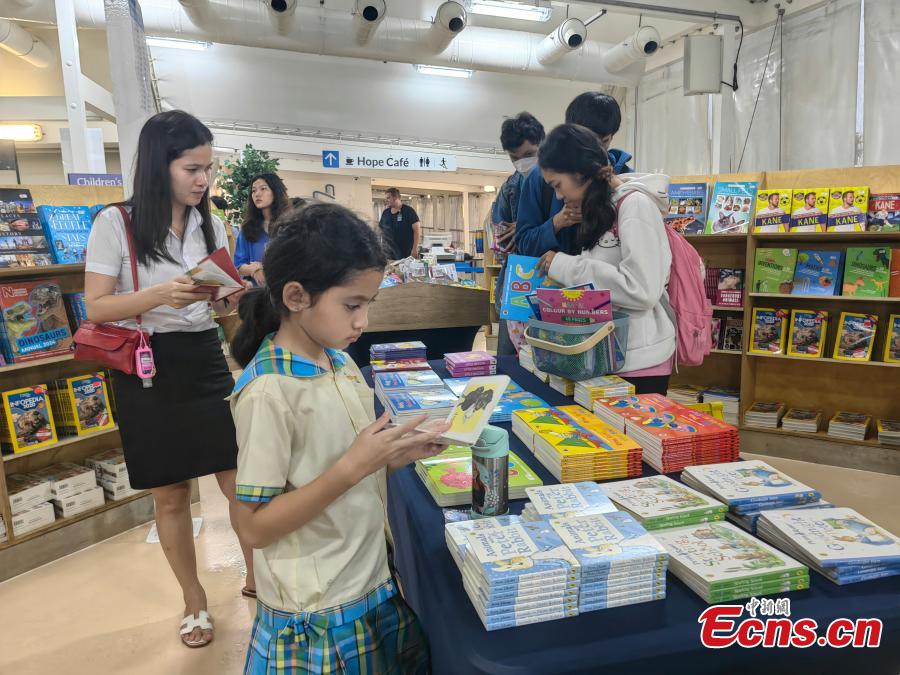 Visitors read books on Doulos Hope, the world's second-largest maritime library ship docking at a port in Phnom Penh, Cambodia, June 5, 2024. (Photo: China News Service/Yang Qiang)